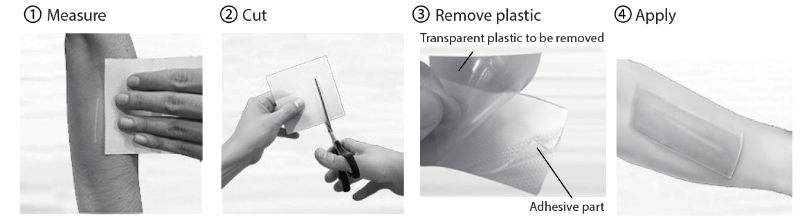 Apply the sheet onto a clean and dry scar. Do not use the product on open and fresh wounds. Remove both protective foils (white and transparent) and apply the sheet over the scar. The scar should be completely covered. If needed, support the sheet with a garment/post-operative bra, bandage, or a hypoallergenic sheet.